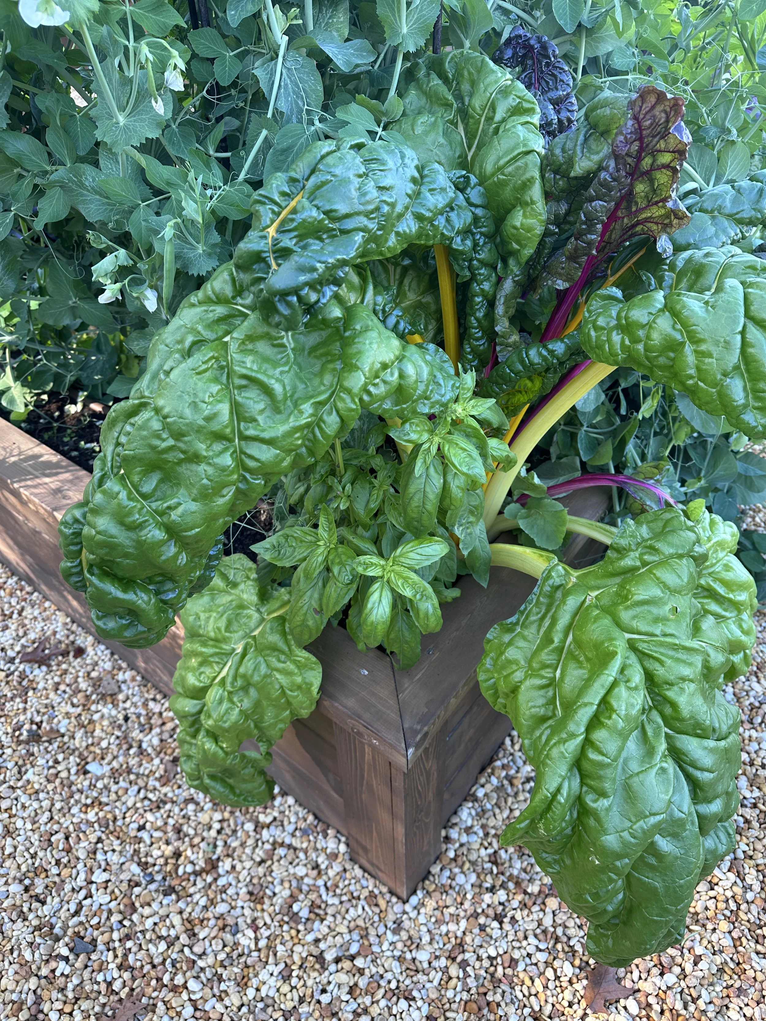 Basil growing in the shade or canopy of Swiss chard and sugar snap peas.